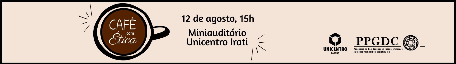 O Programa de Pós-Graduação Interdisciplinar em Desenvolvimento Comunitário da Unicentro (PPGDC) convida a todos e todas para o primeiro encontro do Café com Ética. A iniciativa tem o intuito de trazer pesquisadores das mais diversas temáticas e também membros dos Comitês de Ética da universidade para debater questões tocantes aos cuidados e procedimentos necessários para a realização de pesquisas que envolvem seres humanos. Iniciamos a programação com o tema "Ética em pesquisas com crianças e adolescentes", que será apresentado pela professora Michele da Rocha Cervo, do Departamento de Psicologia da Unicentro. O evento acontece no dia 12 de agosto, às 15h, no Miniauditório do Campus Irati. O Café com Ética fará a certificação dos inscritos presentes no encontro.
