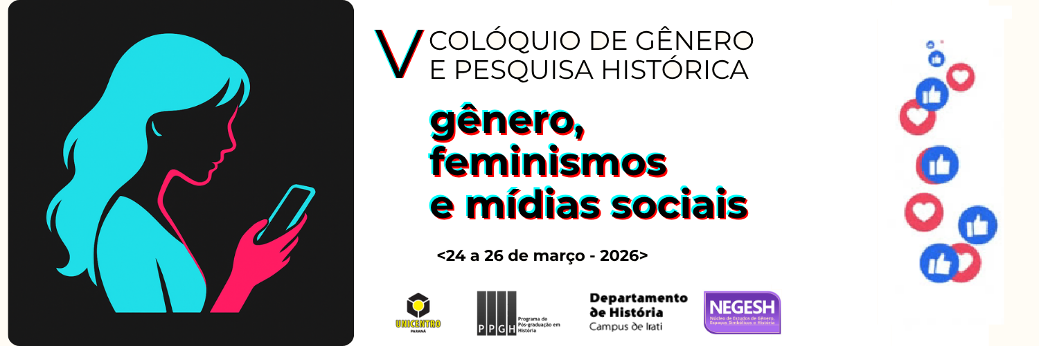 O V Colóquio de Gênero e pesquisa histórica, organizado pelo Departamento de História em conjunto com o Programa de Pós-Graduação em História e o Núcleo de Estudos de Gênero, Espaços Simbólicos e História da Unicentro, Campus Irati-PR, tem como objetivos: proporcionar uma reflexão sobre os estudos de gênero em articulação com a pesquisa e o ensino, com as metodologias de ensino e abordagens de temas contemporâneos, como relações de gênero, multiculturalismo e linguagens culturais na sala de aula; divulgar os resultados de pesquisas de pós-graduação e de docentes, da UNICENTRO e de outras instituições de ensino; promover maior integração entre o ensino e a pesquisa na graduação e pós-graduação; fomentar o debate em torno da historiografia feminista. Destina-se a comunidade acadêmica local, regional, estadual e nacional; estudantes, professores e gestores das escolas de ensino fundamental e médio de Irati-PR e região. O evento contará com os seguintes recursos metodológicos: duas conferências via meet e sessões de comunicações via meet. Espera-se como resultado: a articulação ensino, pesquisa e extensão; maior integração entre graduação e pós-graduação; relações dialógicas entre universidade e sociedade em geral; publicações de anais com textos completos de acadêmicos; publicação de uma coletânea de textos das pesquisadoras convidadas. Inscreva-se!Menu do eventoPrazos de inscrições