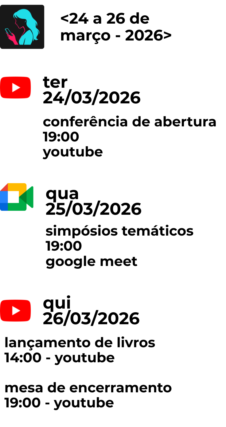 DescriçãoAVISO: Inscrição somente para quem irá apresentar comunicação. ST 8 - Mulheres, Ensino e Tecnologias Digitais: cultura, virtualidade criativa. Coordenação: Dra. Jaqueline Martins Zarbato (UFSC), Dra. Maristela Carneiro (UFMT) e Dra. Janaina Mello (UFS) O ST pretende acolher pesquisas que tratem da História Pública no uso das tecnologias para a formação docente prevista na Lei 14.986/2024, que torna obrigatório o ensino das contribuições das mulheres na história, ciência, artes e cultura do Brasil e do mundo. Congrega as perspectivas e abordagens de gênero e cultura visual, compreendendo e analisando o vasto campo das tecnologias digitais de informação e comunicação (TDIC), à exemplo de sites, mídias sociais, aplicativos, jogos, ferramentas, sistemas de Inteligência Artificial Generativa (IAGen), bens culturais visuais, HQ, enquanto produtores de narrativas digitais e culturais sobre os grupos sociais. Em relação ao gênero, percebe-se que tais construções imprimem significados e significantes fundamentados na perspectiva ‘universal e dicotômica’, silenciando ou produzindo discursos sobre a contribuição feminina e feminista em diferentes tempos e espaços históricos. Mormente são discursos a partir da visão masculina sobre o feminino, enquanto o olhar das mulheres se mantém silenciado. Desta maneira, analisar esse ‘universo digital’, em suas várias camadas e vieses, permite aprofundar as dimensões analíticas da produção do conhecimento histórico, em uma perspectiva crítica, na justaposição de discursos midiáticos e tecnológicos e na interface da “desterritorialização ou da virtualização” (Lévy, 1996). Problematizar os usos das tecnologias como campo de disputas de narrativas acerca das relações de gênero remete a examinar o palco de diferentes cenários e sujeitos que emitem enunciados, nem sempre de subversão, mas muitas vezes de negação das desigualdades de gênero, dos corpos femininos, do saber-fazer de grupos sociais e culturais. Propor a análise sobre vídeos, imagens, sites, canais de Youtube, cartilhas digitais, HQ e outras produções no universo digital, seja na disputa de narrativas e nas discussões didáticas, seja na análise da cultura visual, possibilita fortalecer a formação da consciência histórica tanto para historiadores quanto para professores de História, além de antropólogos visuais, sociólogos, cientistas da informação, filósofos, dentre outros. Assim como permite adentrar em diálogos sobre o ‘ciberativismo político’ e ‘os usos da cibercultura pela extrema direita’ com especial atenção às relações de gênero no sul Global. Local de realizaçãoAmbiente Virtual - Unicentro - - Google Meet Datas e horários