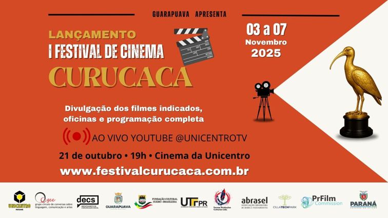 Na próxima terça-feira, dia 21 de outubro, às 19h, acontece o evento oficial de lançamento do 1º Festival de Cinema Curucaca, no cinema da Unicentro – Câmpus Santa Cruz, em Guarapuava. O encontro marca a divulgação dos filmes indicados em cada categoria e competitivas, o lançamento das oficinas e a apresentação da programação completa do festival, que será realizado entre os dias 03 e 07 de novembro de 2025.