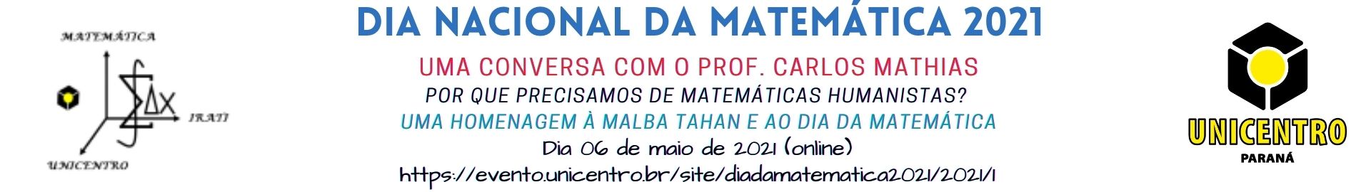 O Dia Nacional da Matemática é uma atividade extensionista que complementa a Semana de Estudos de Matemática, na modalidade de evento de extensão, na categoria de projeto de extensão por tempo determinado, vinculado ao Programa de Extensão Permanente Laboratório de Educação Matemática, do Campus de Irati, aprovado pela RESOLUÇÃO Nº 003-SEAA/I/UNICENTRO, DE 6 DE MAIO DE 2020, sem financiamento externo. Na edição de 2021, contaremos com a presença do Prof. Dr. Carlos Eduardo Mathias Motta, do Instituto de Matemática da Universidade Federal Fluminense. O Prof. Carlos Mathias é Doutor em Matemática pela Universidade Federal do Rio de Janeiro, mesma instituição em que concluiu seu mestrado em 1989. Atualmente é Professor Associado do Departamento de Matemática Aplicada (GMA) da Universidade Federal Fluminense. Foi professor do IME, entre 1990 e 1993, e da UFRRJ, entre 1994 e 2009. Possui pesquisas nas áreas de Educação Matemática e Matemática Pura. Desenvolvedor do DRUMMATH, uma metodologia de ensino de Matemática para deficientes visuais que utiliza apenas sons e atividades motoras, atua nas áreas de Avaliações em Larga Escala (Elaboração de Itens, Interpretações Pedagógicas, Elaboração de Matrizes Interpretação de Escalas de Proficiência), História e Filosofia da Matemática. Atuou como Capacitador dos Elaboradores e Revisores de Itens (ENEM/SAEB/ENCCEJA) e na Interpretação de Escalas (SAEB/PROVA BRASIL, ENEM) no INEP/MEC. Foi Supervisor na Área de Matemática da Plataforma Devolutivas Pedagógicas do INEP/MEC. É assessor e consultor ad hoc do INEP/MEC, da SEB/MEC, da Fundação Carlos Chagas (avaliador da qualidade das questões e das provas da OBMEP 2016/2017/2018/2019), da Fundação Cesgranrio, da UNESCO e da OCDE (codificação do PISA for Schools), especialista na Análise, Elaboração, Revisão e Interpretação Pedagógica de Itens para Avaliações em Larga Escala (ENEM, Prova Brasil/SAEB, ENCCEJA, SARESP, SIADE), Currículo em Matemática, Matrizes de Referências Curriculares e Interpretações e Elaboração de Escala de Proficiência. Nos anos de 2011, 2014 e 2017 coordenou a correção nacional das questões discursivas do ENADE, relativas aos cursos de Bacharelado e Licenciatura em Matemática. Em 2012, participou da equipe de Interpretação e Elaboração da Escala do ENEM e na Capacitação de Elaboradores de Itens de Matemática para o SAEB (5º ano EF e 3º ano EM). Elaborou os vídeos instrucionais sobre as estatísticas clássicas e TRI no Projeto Devolutivas Pedagógicas INEP/MEC. Membro do Grupo de Discussão de Reformulação das Matrizes do SAEB Matemática. É o coordenador do Programa Matemática Humanista (Facebook, YouTube, Instagram e Twitter), que atua na divulgação da Filosofia Humanista da Matemática e suas implicações em ensino, aprendizagem, avaliação e currículo. Vice coordenador do Núcleo de Avaliação Educacional da Universidade federal de Ouro Preto (UFOP), professor convidado do Programa de Pós-Graduação em Educação da UFOP, professor convidado do Programa de Pós-Graduação em Música da UFRJ, na área de pesquisa em música e matemática e membro do Grupo de Pesquisa em Música e Matemática da UFRJ – MUSMAT. É músico profissional (baterista) desde 1993. A página Matemática Humanista pode ser acessada pelo endereço https://www.matematicahumanista.com.br/. Na ocasião, o Prof. Carlos Mathias abordará a seguinte temática: "Por que precisamos de Matemáticas Humanistas? Uma Homenagem à Malba Tahan e ao Dia da Matemática". Haverá certificação para os participantes que se inscreverem e que responderem ao formulário de presença a ser disponibilizado no final da live. O início da transmissão está previsto para as 19h30min do dia 06/05/2021, uma quinta-feira.