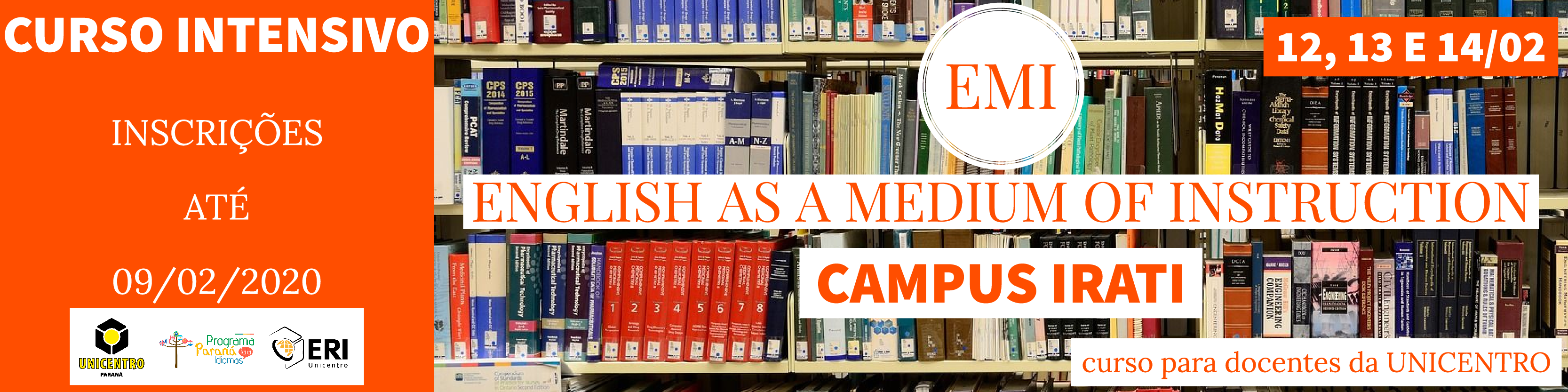 O EMI – English as a Medium of Instruction – é um curso direcionado aos professores da UNICENTRO que têm interesse em ministrar suas aulas em inglês. O objetivo é proporcionar aos professores subsídios linguísticos e teórico-metodológicos para a preparação, desenvolvimento e oferta das suas disciplinas utilizando-se do inglês como forma de instrução.