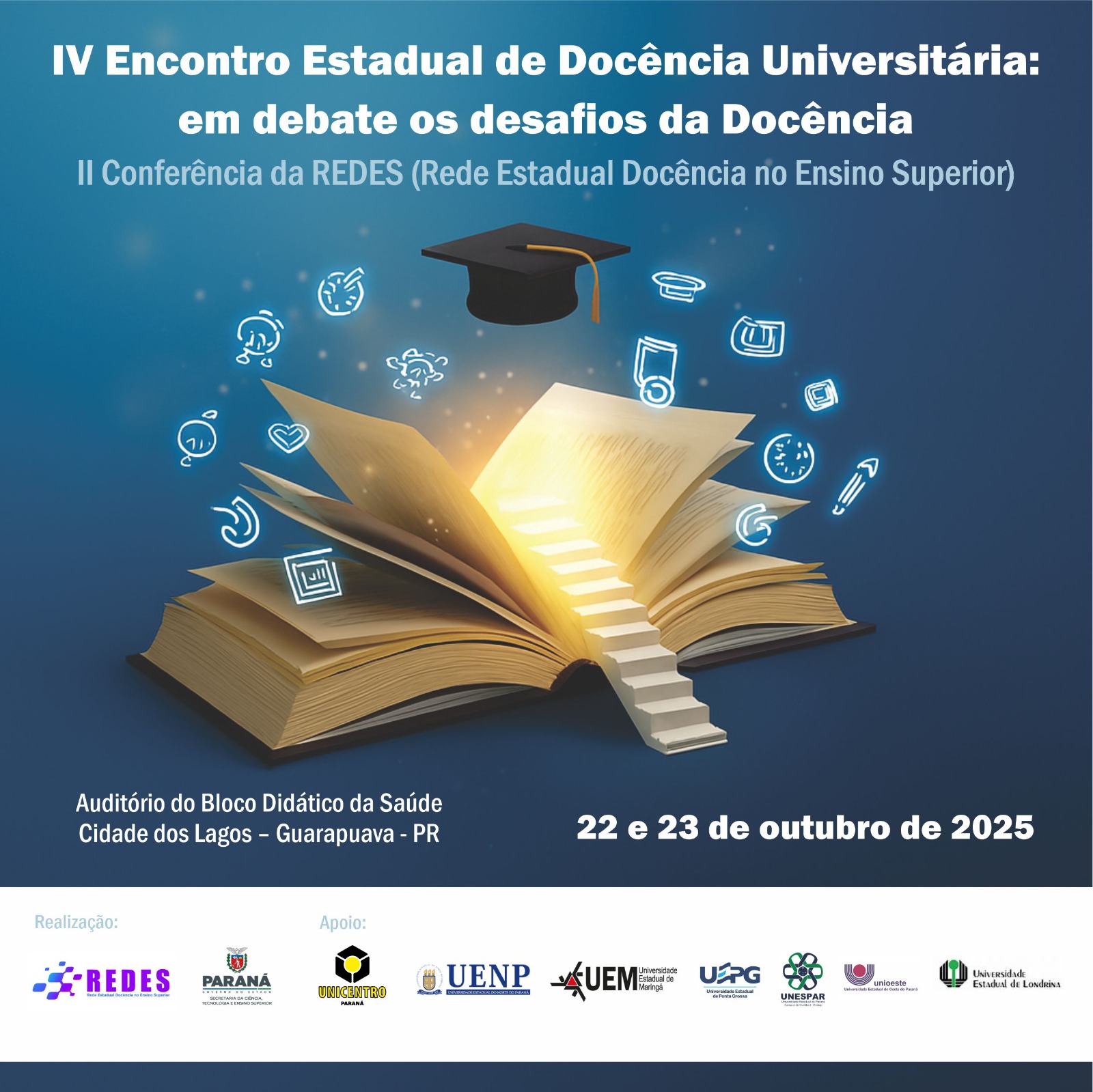 O IV Encontro Estadual de Docência Universitária: em debate os desafios da Docência e a 2ª Conferência da REDES/SETI-PR, tem o objetivo de promover debates, oficinas e rodas de conversa sobre os desafios contemporâneos da docência universitária, fortalecendo a formação pedagógica, a troca de boas práticas e a articulação interinstitucional.