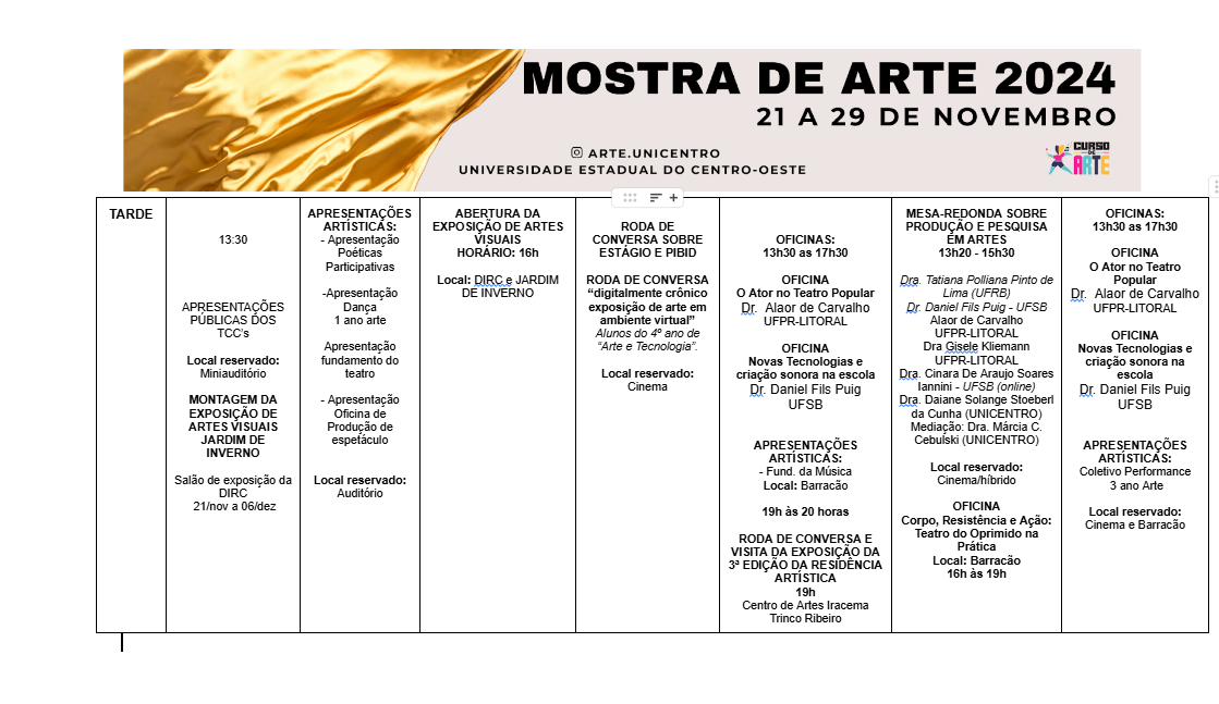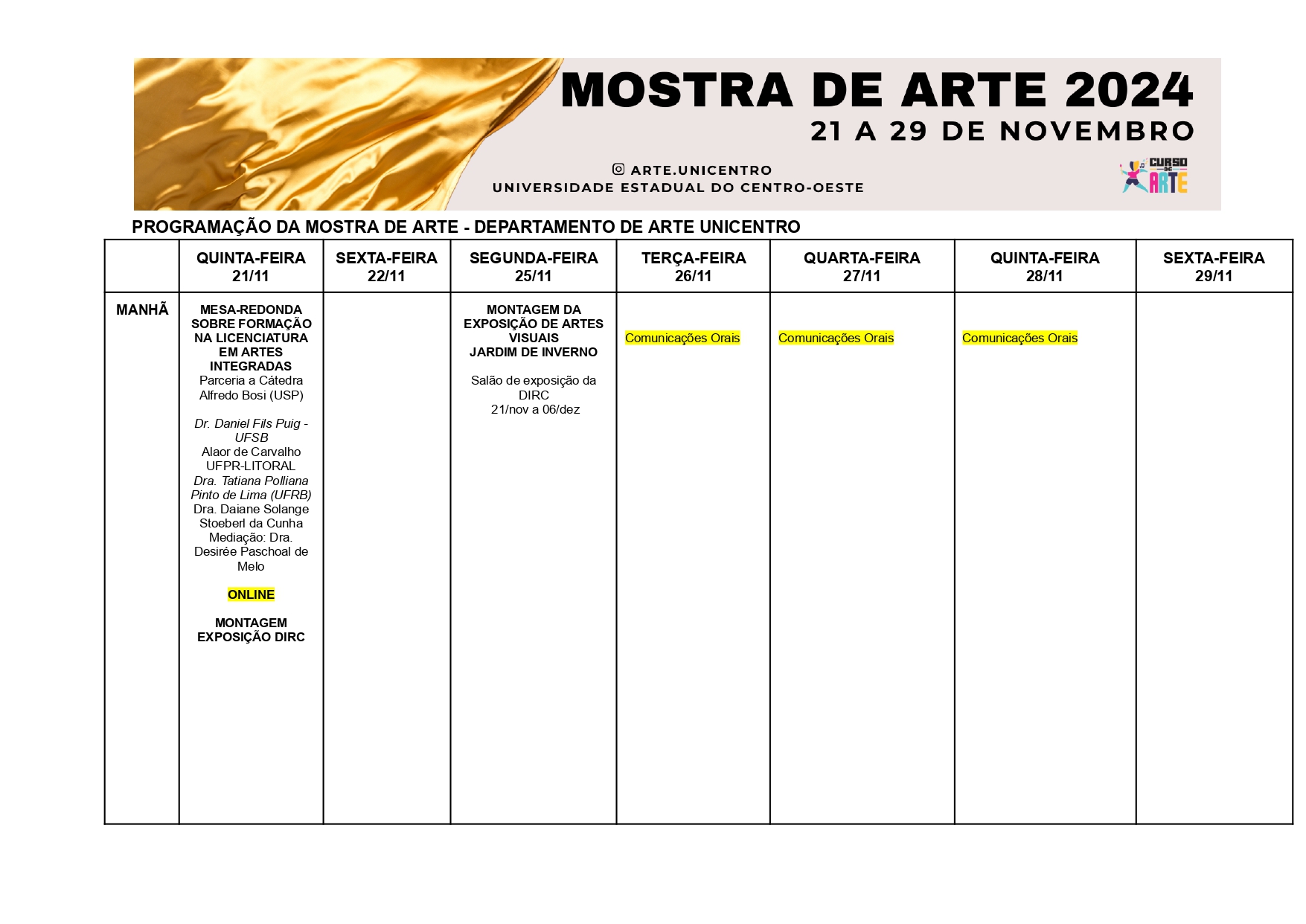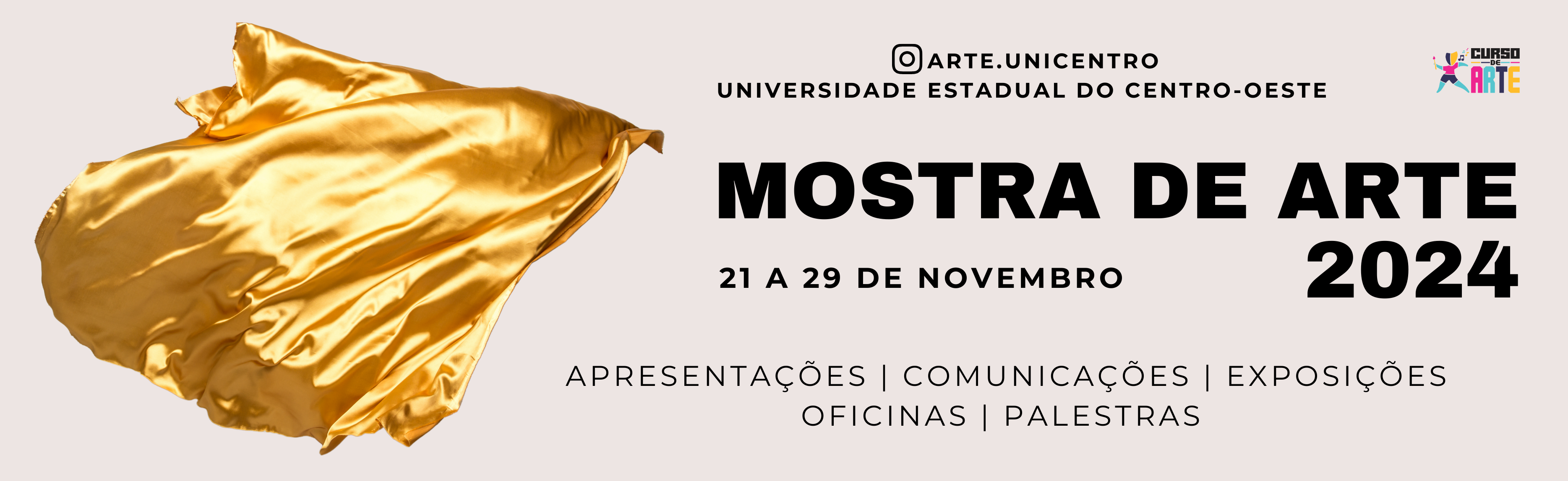 Mostra de Arte 2024 com abrangência nacional, caracteriza-se como Evento de Extensão, vinculado ao Grupo de Pesquisa em Artes-CNPq, com parceria das Universidades UFPR- Litoral e UFSB. Tem como objetivo possibilitar aos participantes, acadêmicos ou não, propagação de conhecimento científico na área de Arte, bem como a vivência em processos criativos e a experimentação de práticas pedagógicas em Arte. Por meio de sessões de comunicação de pesquisas, palestras e mesas redondas e da exposição artística com mostra de artes visuais, apresentações artísticas serão enfatizadas as questões relativas às Artes Integradas, Processos Criativos e seu Ensino.