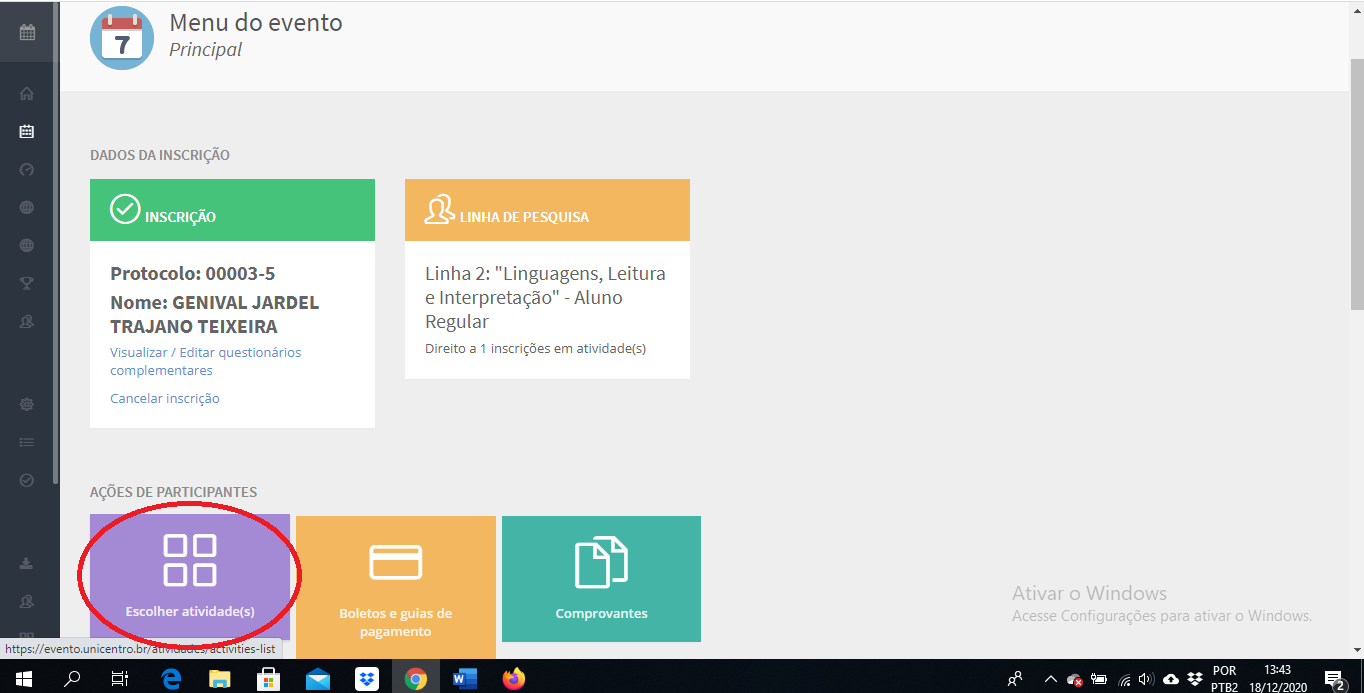 1. Entra no Menu do evento e clica em "Escolher Atividade(s)".