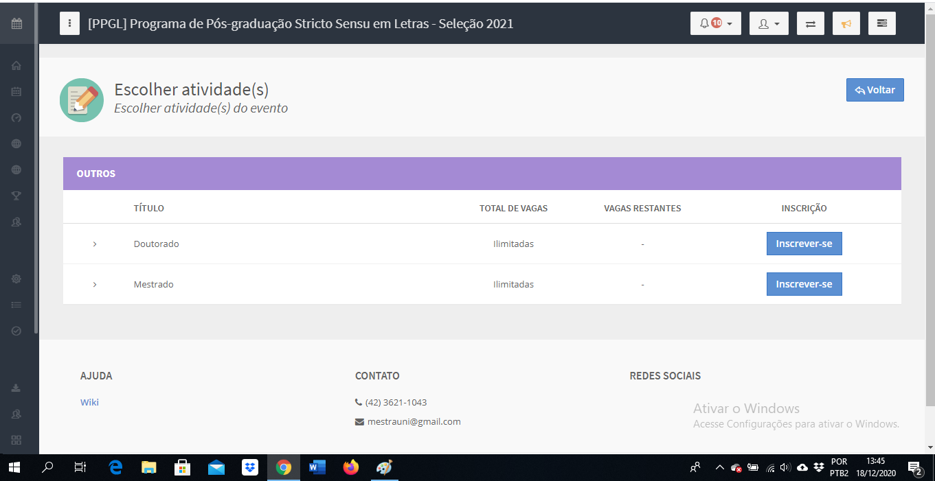 2. Após clicar em "Escolher Atividade(s)", escolher Mestrado ou Doutorado.