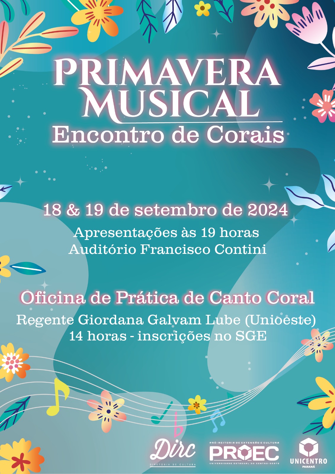 A Primavera Musical é um dos eventos organizados pela Diretoria de Cultura desde 2022 com o objetivo de difusão e democratização de acesso à arte e à cultura. A temática da 3ª edição será - Encontro de Corais - que tanto abrirá espaço para apresentar o trabalho realizado pelo Programa Unimúsica com os Corais Opus III e Unicanto quanto oportunizar apresentações de Corais da cidade e região. O evento acontecerá nos dias 18 e 19 de setembro e contará com uma oficina de Prática de canto coral ministrada por Giordana Galvan Lube da Divisão de Cultura da Pró-reitoria de Extensão da Unioeste. Nesta instituição, Giordana rege o Coral Unioeste Encanta: Cascavel e o Coral Unioeste Encanta: Hospital Universitário do Oeste do Paraná. É pedagoga e especialista em Arte Educação. Graduada em Licenciatura em Música pela Unimes, de Santos- SP e pós-graduada em Regência Orquestral em Santos – SP.
