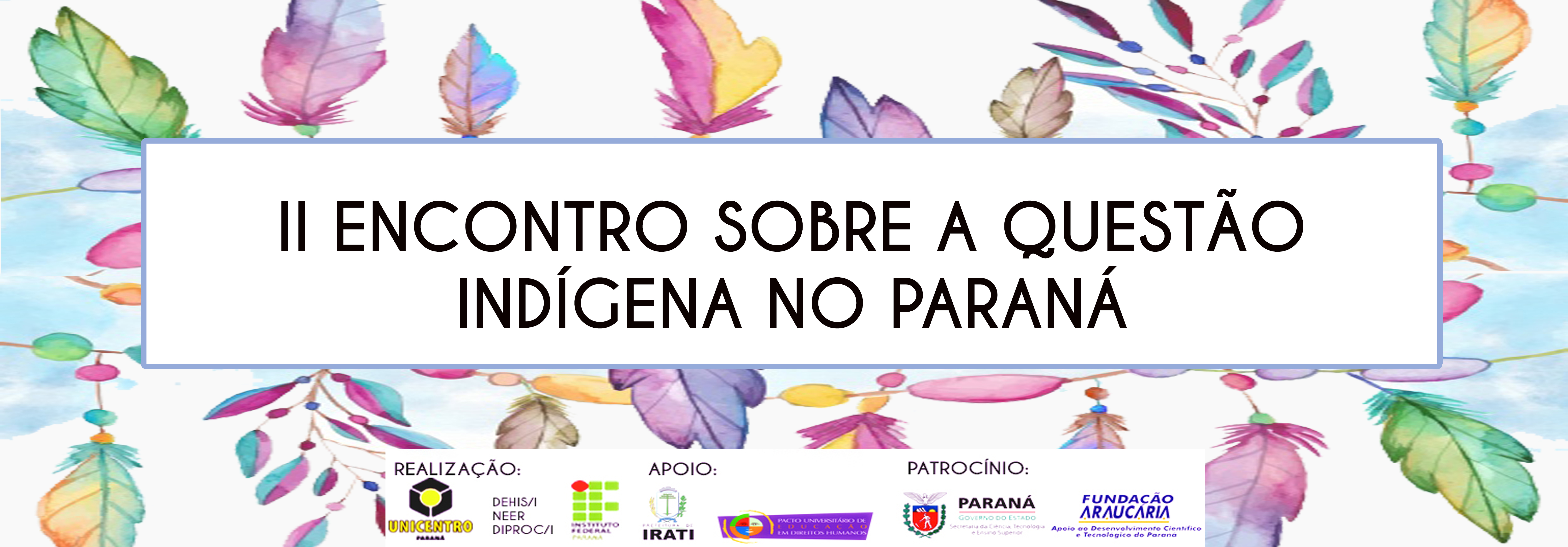 Em 2018 foi realizado na UNICENTRO (DEHIS, NEER e DIPROC), no mês de outubro um evento sobre a questão indígena no Paraná que contou uma apresentação cultural do grupo Nhe´e Miri da tekoa Palmerinha do Iguaçu, município de Chopinzinho-PR, seguida de mesa com professores da própria Tekoa. Foi estimulante e suscitou a nossa preocupação em fomentar mais espaços de visibilidade para os grupos indígenas e para o debate e apresentações de pesquisas sobre a temática. Neste ano, nos propomos a realizar uma segunda edição do evento com a parceria do IFPR. De forma ampliada prevemos atividades para três dias nos quais incluímos a apresentação de trabalhos de pesquisadores em Conferências, Mesas Redondas e Oficinas Temáticas e a participação dos indígenas Kaingang da Reserva do Ivaí e dos acampados itinerantes em Irati, propiciando assim um espaço para maior aproximação e diálogo entre estes indígenas e a comunidade acadêmica e estudantil, através das atividades propostas e também da montagem de quiosques para exposição dos artefatos culturais confeccionados pelo grupo.