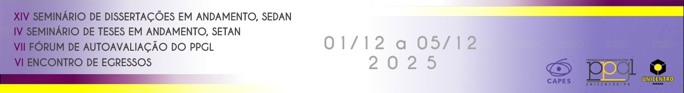 XIV SEMINÁRIO DE DISSERTAÇÕES EM ANDAMENTO, SEDAN - IV SEMINÁRIO DE TESES, SETAN - VII FÓRUM DE AUTOAVALIAÇÃO DO PPGL - VI ENCONTRO DE EGRESSOS