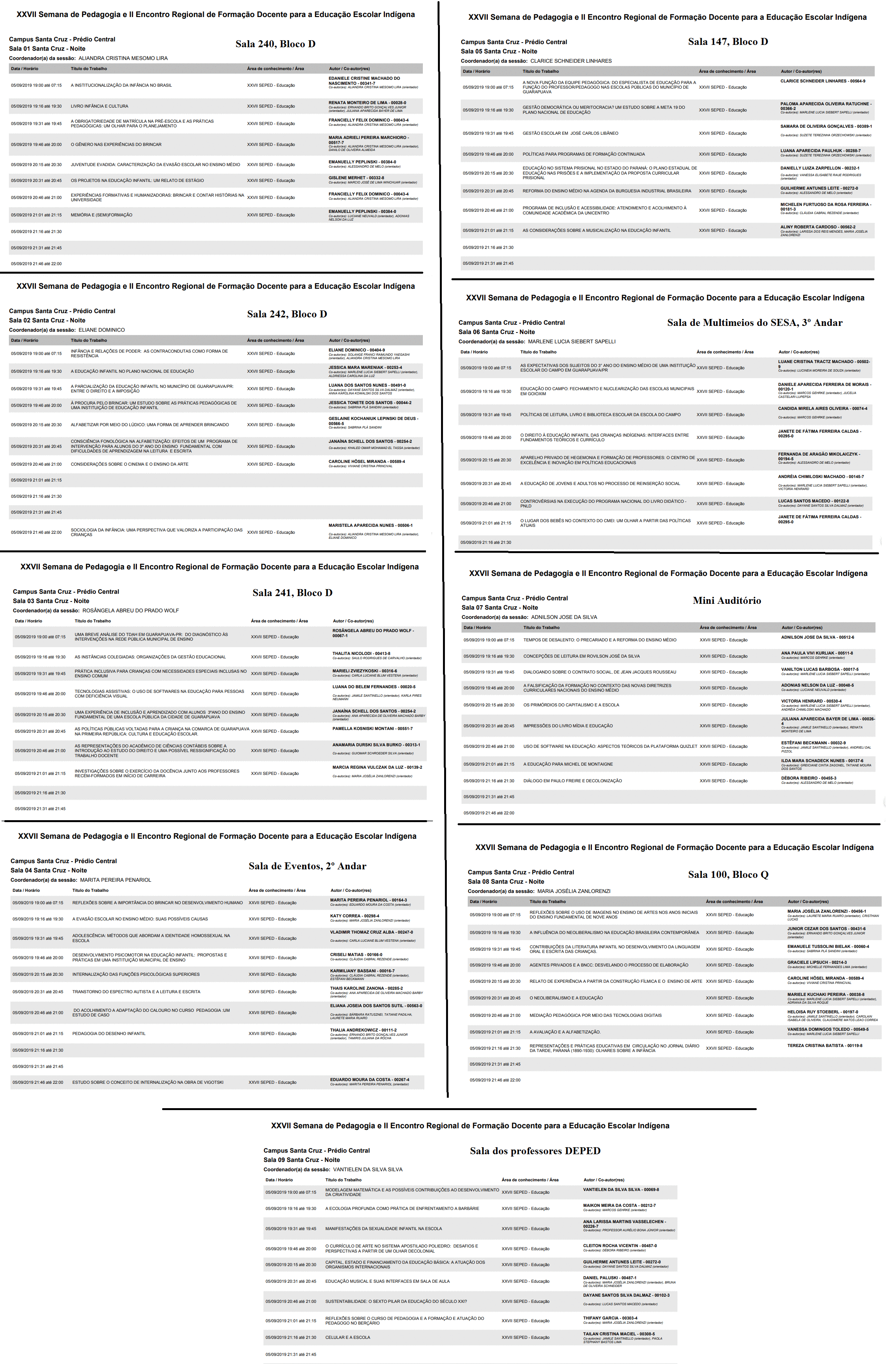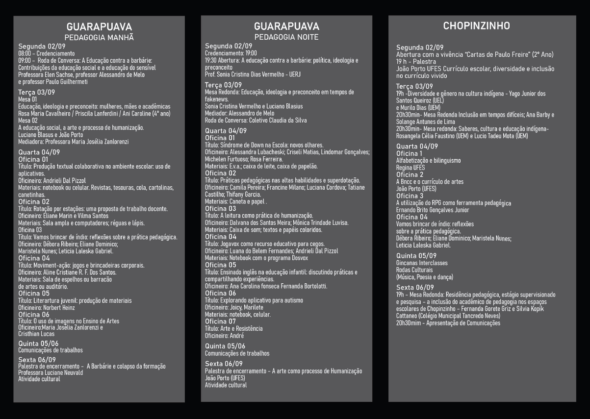 A XXVII Semana de Pedagogia, que em 2019 terá como título "Educação contra a barbárie: política, ideologia e preconceito" será desenvolvida no Campus Santa Cruz e campi avançados de Chopinzinho, Laranjeiras do Sul e Pitanga. Junto a ela, ocorrerá o II Encontro Regional de Formação Docente para a Educação Escolar Indígena. O objetivo dessa semana de estudos é aprofundar os debates sobre educação e formação humana no sentido de desenvolvimento de ações menos alienadas no âmbitos em que a educação acontece. O público-alvo da Semana são acadêmicos/as do curso de Pedagogia e de outras Licenciaturas, tanto da UNICENTRO quanto de outras faculdades e universidades em âmbito local e regional e profissionais da educação em todos os níveis e modalidades de ensino. As formas de participação do público em geral no evento são as seguintes: ouvintes ou apresentadores de trabalho. O tema deste ano, que dá nome à Semana, está vinculado à necessidade de entender os ataques à democracia em nosso país, assim como unificar e fortalecer estratégias de resistência e transformação social por meio da educação de qualidade. Para tanto, serão ofertadas palestras, mini-cursos, oficinas pedagógicas e mesa-redondas com profissionais que pesquisam a educação e suas diferentes interfaces. Solicitamos que o possível superávit do evento seja utilizada para publicações do DEPED, como os Cadernos Pedagógicos, bem como para publicações referentes às produções do Programa de Pós-Graduação em Educação - PPGE/UNICENTRO.
