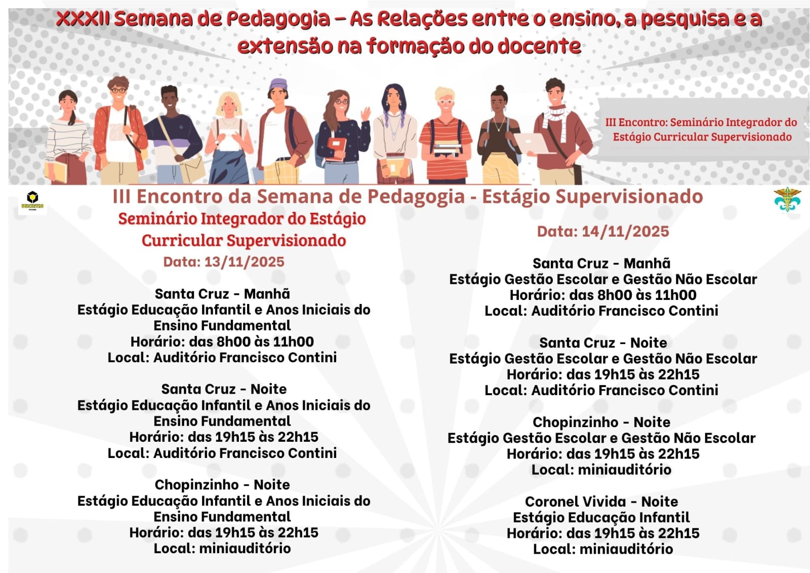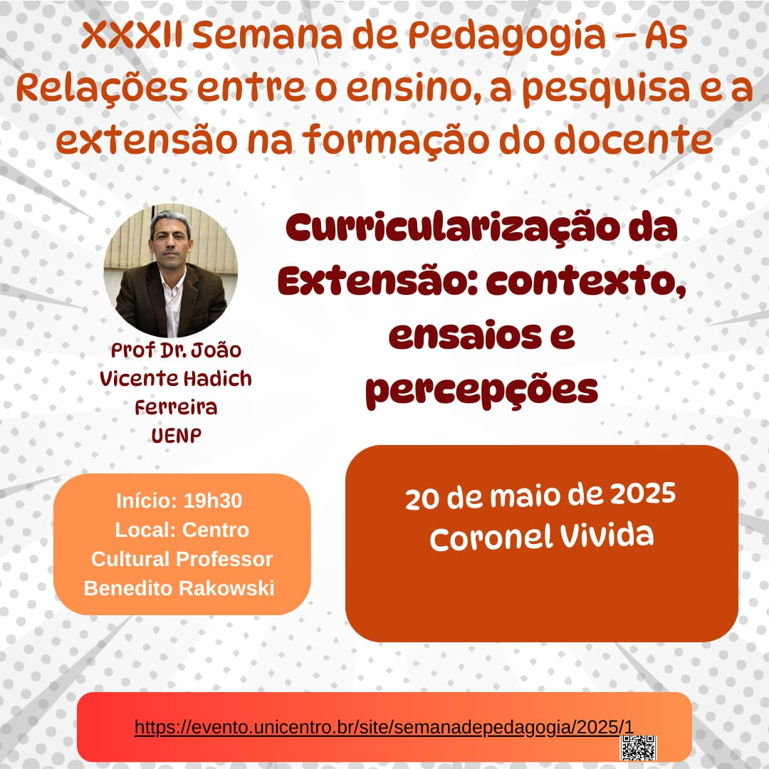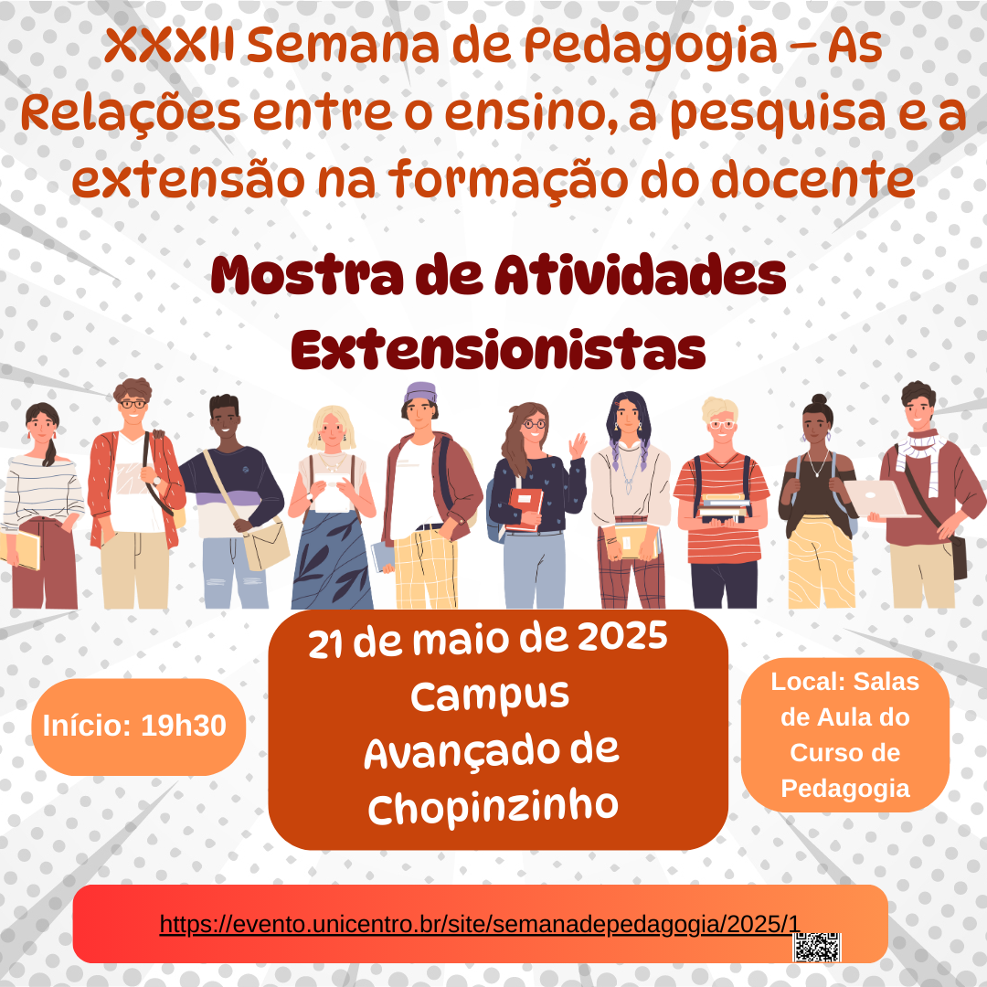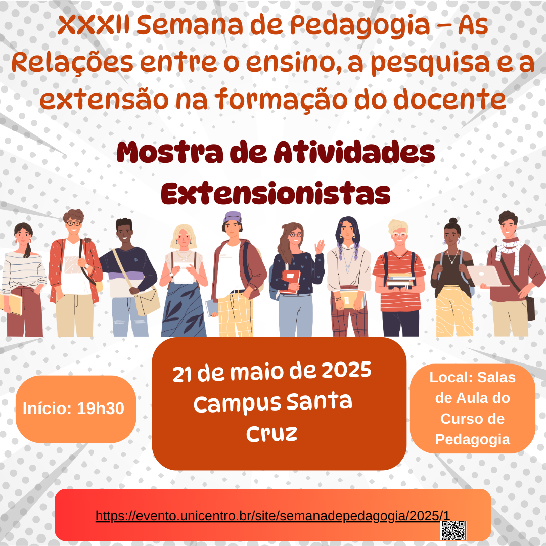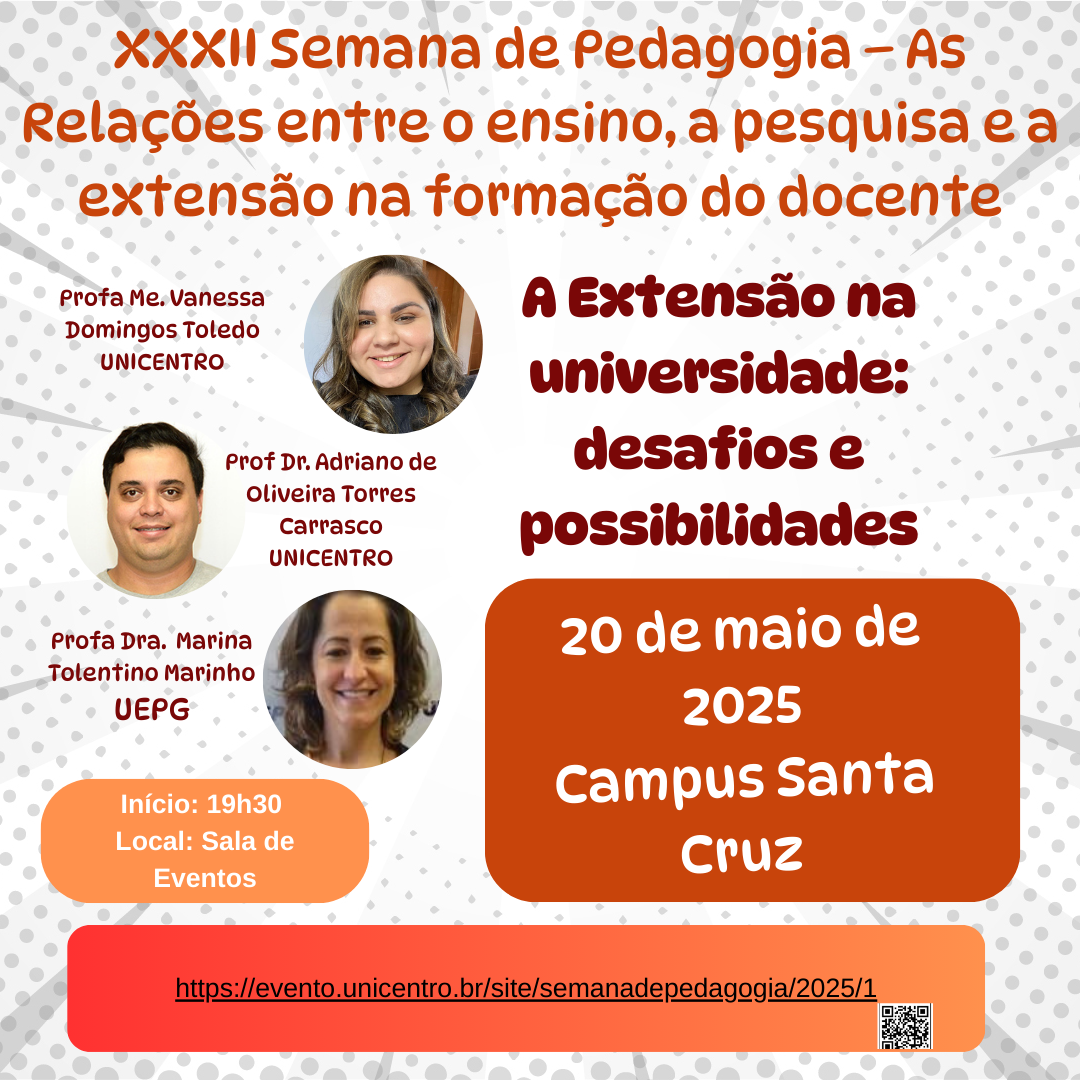 A XXXII Semana de Pedagogia - SEPED é um evento de extensão que integra o Projeto Pedagógico do Curso de Pedagogia da UNICENTRO/Guarapuava e tem por finalidade promover a discussão de temas importantes para a formação do pedagogo, bem como, divulgar a produção científica e os projetos de extensão ligados ao curso. Esta é uma iniciativa acadêmica dedicada à reflexão e debate sobre os pilares fundamentais da formação em Pedagogia: ensino, pesquisa e extensão. Este evento promoverá uma rica troca de ideias e experiências, incentivando o desenvolvimento integral dos futuros licenciados. Com uma programação abrangente, o evento será realizado ao longo de seis dias, distribuídos em seis etapas durante o ano letivo de 2025, nas instalações da UNICENTRO-PR nos campi Santa Cruz, Chopinzinho e Coronel Vivida. Entre os destaques, haverá apresentações de trabalhos sob a forma de resumos expandidos, que serão publicados nos Anais do Evento, contribuindo para a disseminação e registro do conhecimento gerado.