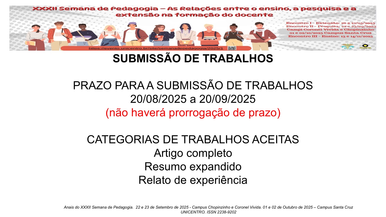 Atenção: Certificados de publicação já está disponível no SGE (Meus certificados). Para acessar aos trabalhos pubicados, clique no Link para acessar a página dos Anais da XXXII Semana de Pedagogia - LINKXXXIISEPED.