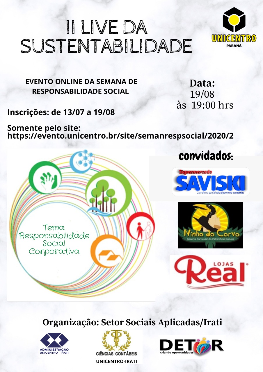 Trata-se de atividade não presencial, nominada “Live da Sustentabilidade Regional”, componente da Semana de Responsabilidade Social do Setor de Ciências Sociais Aplicadas da Unicentro, no Campus Irati, com transmissão ao vivo pelo endereço: https://youtu.be/eUaal7P11Ps Uma mesa redonda que articule teoria e prática da RSC - Responsabilidade Social Corporativa, no âmbito acadêmico da Unicentro e entre Gestores da prática organizacional regional. Para tanto participam três gestores de organizações regionais (Prudentópolis), mediados por um Professor do Setor de Conhecimento na área de Estudos Organizacionais. O evento pretende oportunizar a reflexão e discussão do tema central, tanto quanto, promover a integração Universidade/Organizações.