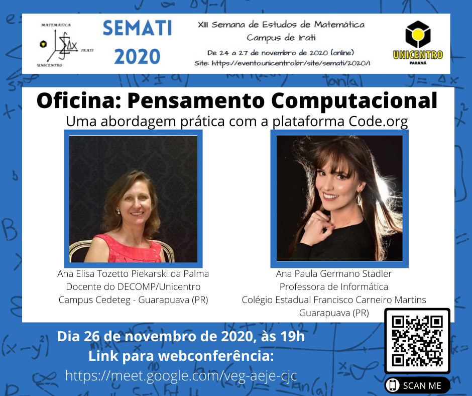 A Semana de Estudos de Matemática, em sua 13ª Edição, a ser realizada no período de 24 a 27 de novembro, no Campus de Irati da Universidade Estadual do Centro-Oeste - Unicentro - tem por objetivo proporcionar atividades extracurriculares que visem a complementação da formação dos acadêmicos do Curso de Matemática da Unicentro/Campus Irati, bem como propiciar a professores da educação básica, a atualização dos seus conhecimentos na área de Matemática e a oportunidade de trocar experiências, discutir e refletir as suas práticas pedagógicas. Serão realizados minicursos e oficinas temáticas. Os participantes serão avaliados pela participação nas atividades. Espera-se que a proposta possa oportunizar, aos acadêmicos e demais participantes, momentos de discussão sobre saberes específicos e pedagógicos da área de Matemática.