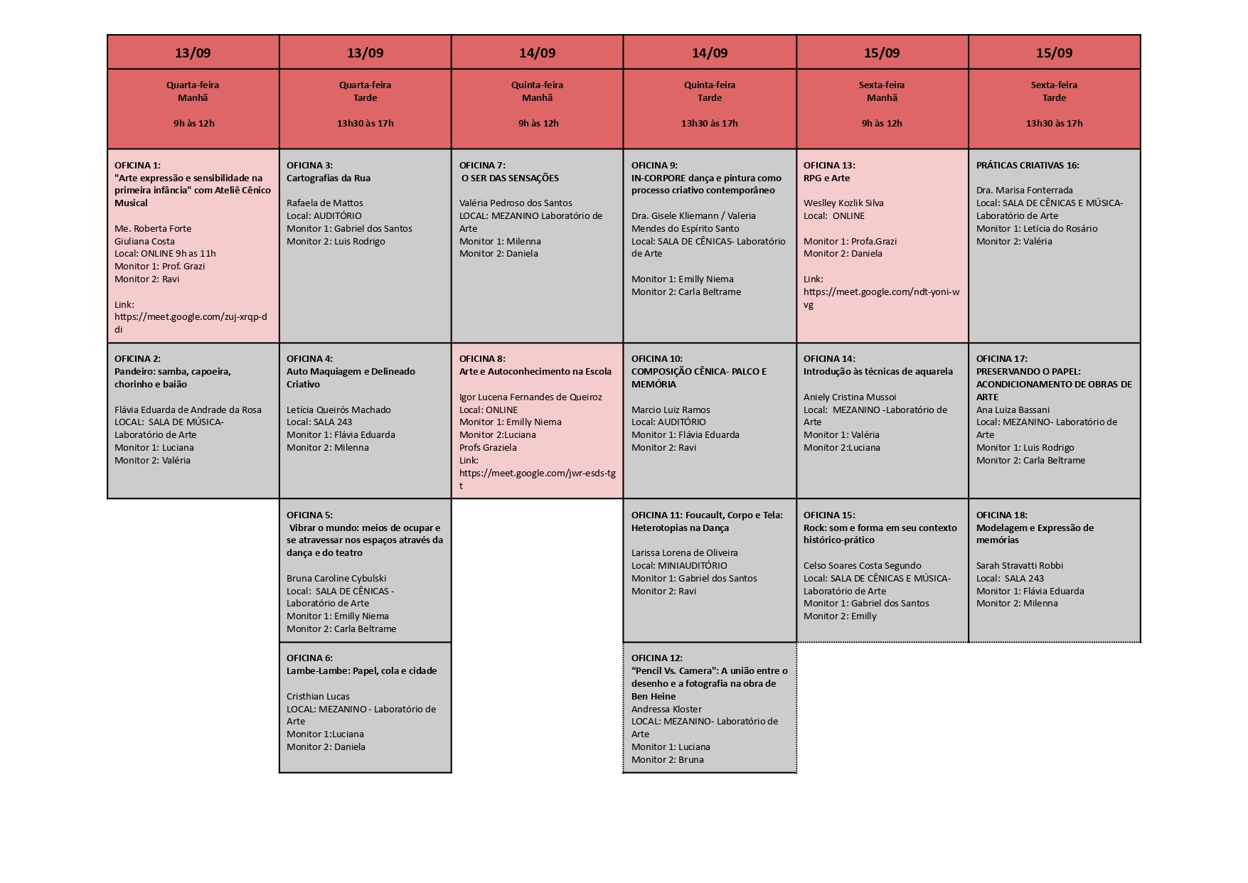 - As temáticas das oficinas são bem variadas: artes visuais, dança, teatro, música e artes integradas