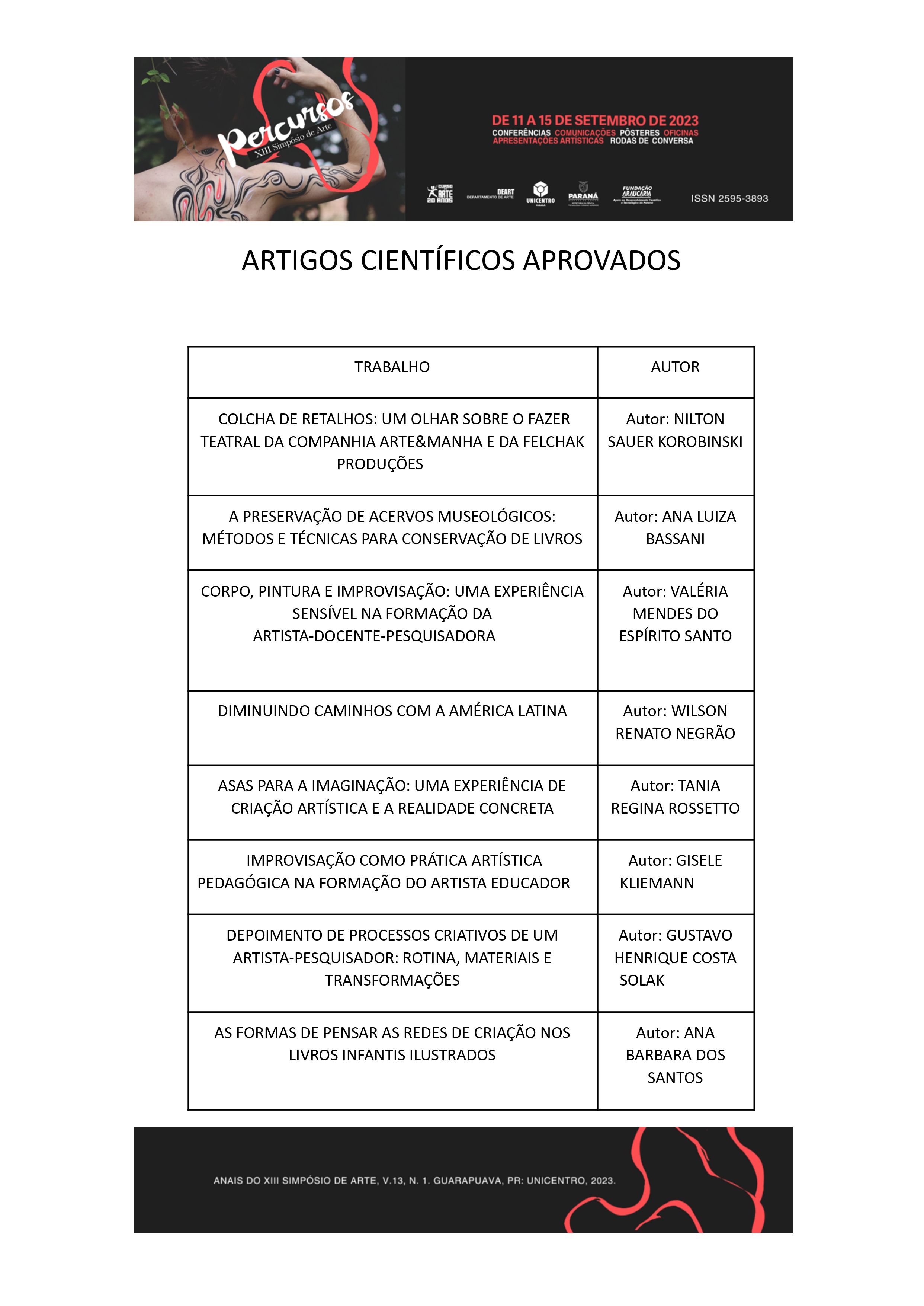 NOVA DATA LIMITE: 30 de agosto de 2023: Divulgação dos aprovados com TRABALHOS (artigos - comunicações, resumos expandidos - pôsteres e propostas artísticas)