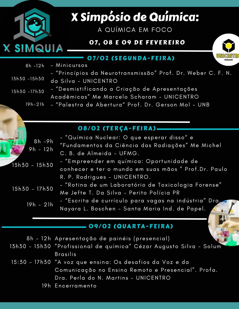 O Simpósio de Química (SIMQUIA) tem reunido docentes, discentes da graduação, da pós-graduação, do ensino médio e técnico. No X SIMQUIA, a programação do evento envolve diversos tópicos relacionados a Química, de modo a promover a integração da comunidade acadêmica. A estrutura das atividades previstas no evento envolve palestras e minicursos com temas relevantes de química, tanto na área de ensino com na área tecnológica e que contribuirá na formação dos graduandos do curso.