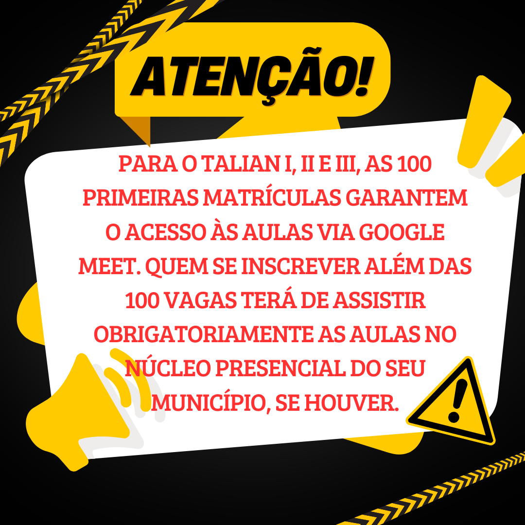 Observação Importante: Para o Talian I, II e III, as 100 primeiras matrículas garantem o acesso às aulas via Google Meet. Quem se inscrever além das 100 vagas terá de assistir obrigatoriamente as aulas no Núcleo Presencial do seu Município, se houver.