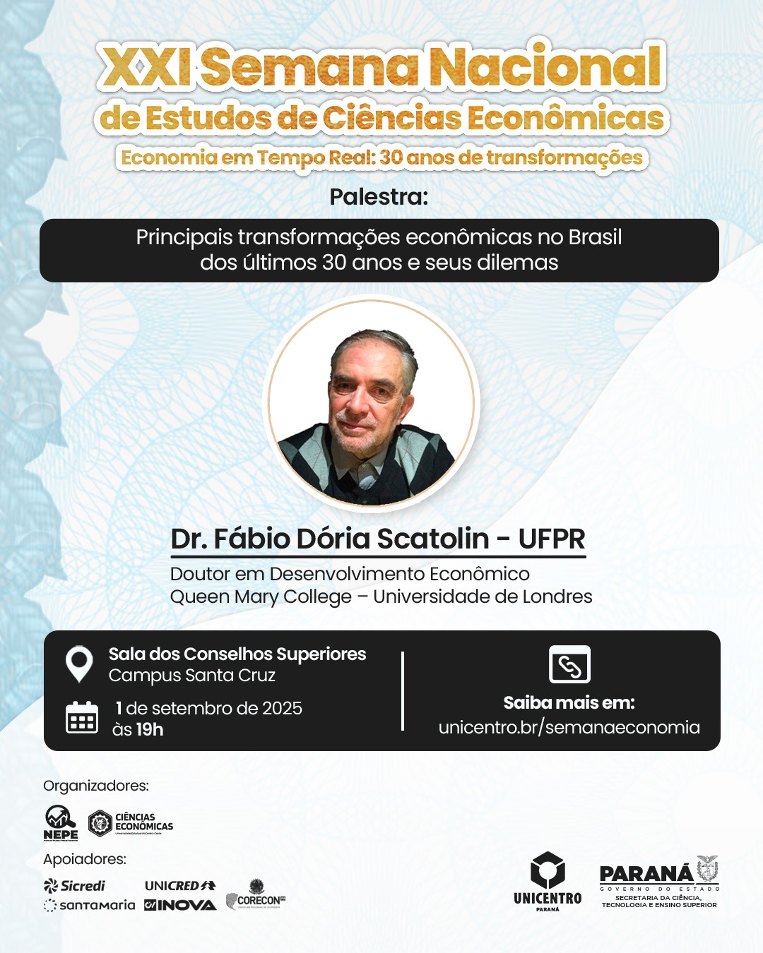 O Departamento de Ciências Econômicas da Unicentro (Câmpus Santa Cruz, em Guarapuava-PR) tem o prazer de convidá-lo para participar da XXI Semana Nacional de Estudos de Ciências Econômicas, que será realizada no Câmpus Santa Cruz (Guarapuava).
